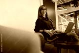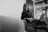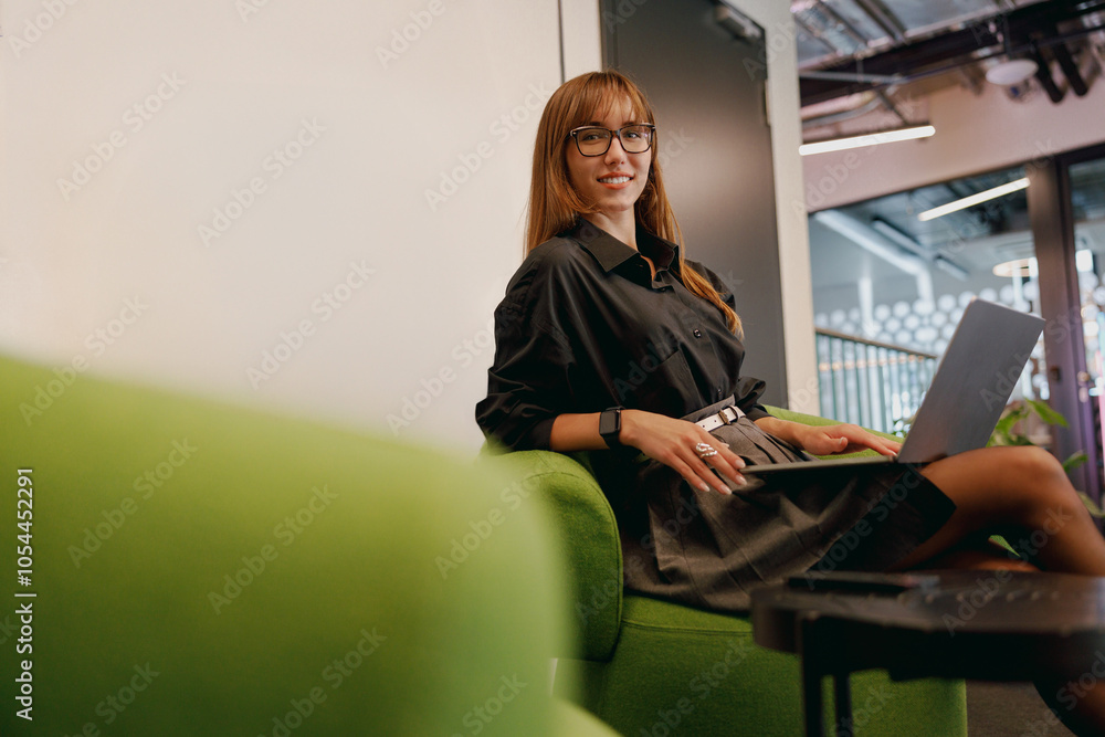 A confident, professional woman diligently working on her laptop in a bright, modern, and inspiring office setting