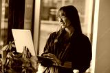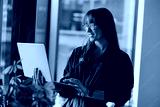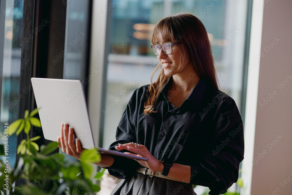 A highly focused woman is intently using a laptop, surrounded by vibrant plants in a bright, modern office space