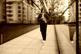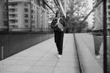 A trendy and fashionable individual taking a leisurely stroll through a modern urban environment filled with life