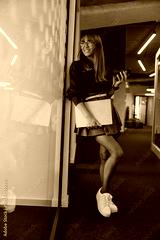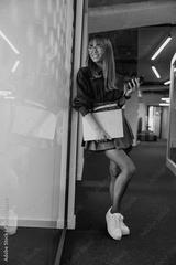 A selfassured young woman dressed in a trendy chic outfit striking a confident pose in a modern office environment