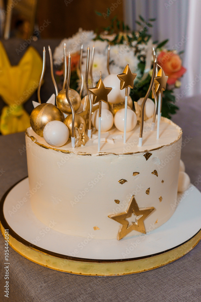 Elegant White Cake with Gold Decorations and Stars