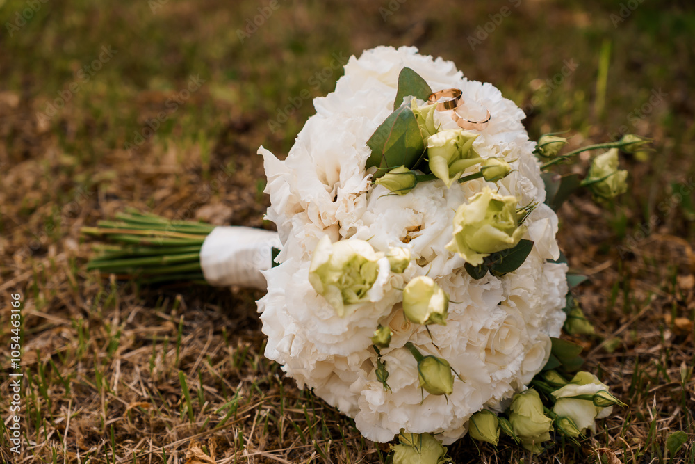 Elegant White Flower Bouquet with Wedding Rings on Grass