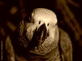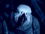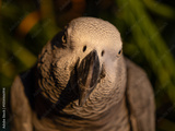 CLOSE UP, PORTRAIT, DOF: Curved black beak of a Congo African Grey parrot looking towards camera. Highly intelligent domesticated exotic companion parrot who loves to imitate and entertain people.