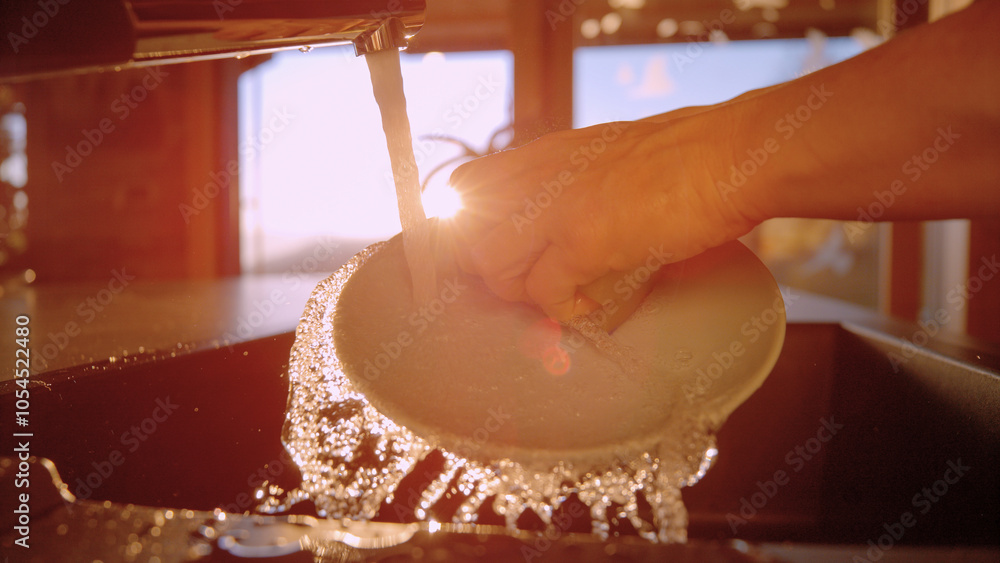 CLOSE UP, LENS FLARE: Person cleaning a dirty plate under modern kitchen faucet. Running tap water glistens as hand washes a dish with a sponge in golden morning light. Household chores for clean home