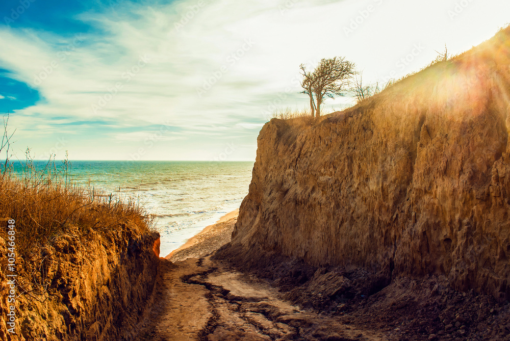 Awesome landscape of bright sunset at the seashore and mountain slopes with trees on the blue sky background. Natural colorful view