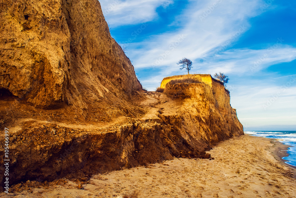 Awesome landscape of bright sunset at the seashore and mountain slopes with trees on the blue sky background. Natural colorful view