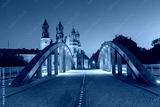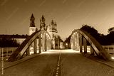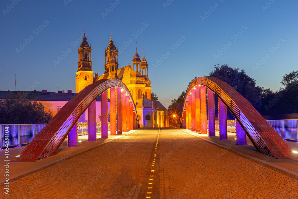A view of the Cathedral Basilica of St. Peter and St. Paul seen through the vibrant red structure of the Jordan Bridge at sunrise in Poznan, Poland