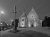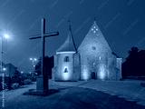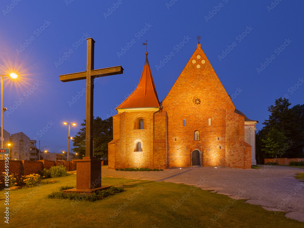 The Church of St. John of Jerusalem Outside the Walls in Poznan, Poland, illuminated at dusk with a large wooden cross in the foreground