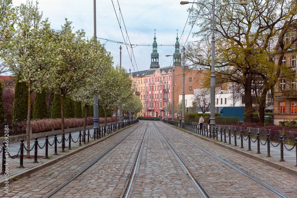 A view down tram tracks lined with blooming trees in Poznan, Poland, leading towards historic pastel-colored buildings