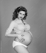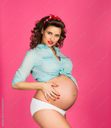 Pin up retro styled studio shot of a surprised pregnant woman. Photograph taken in studio on a pink, vibrant background with copy space.