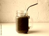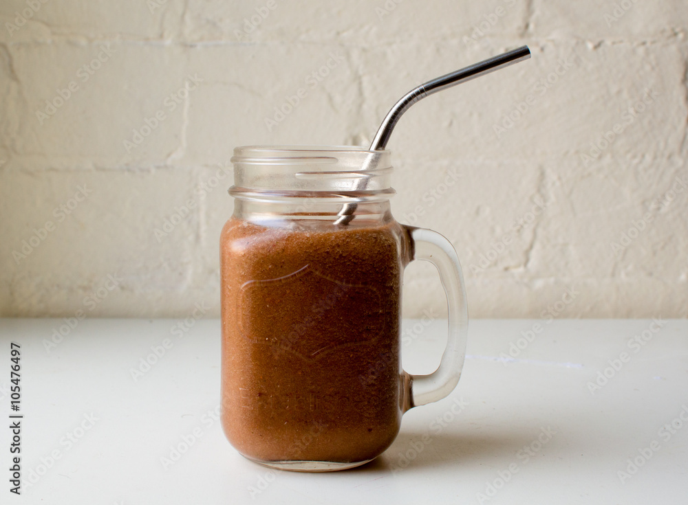 Berry smoothie in glass mug with metal straw on white table against white brick wall
