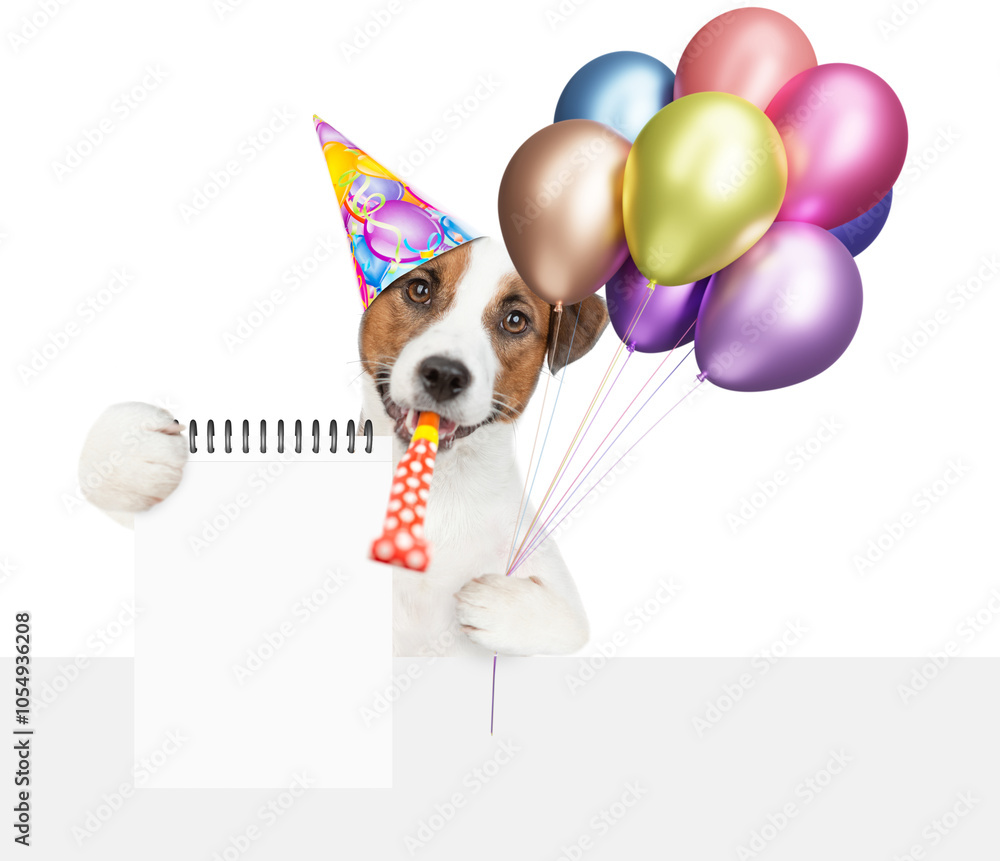 Happy jack russell terrier puppy wearing party cap holds balloons and shows empty list above blank white banner. Empty space for text. isolated on white background