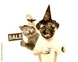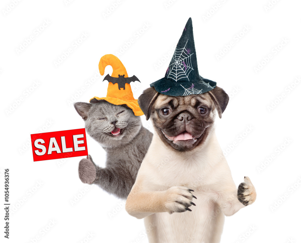 Happy cat and Pug puppy wearing hats for halloween looks at camera. Dog shows thumbs up gesture. Kitten shows signboard with labeled "sale". isolated on white background