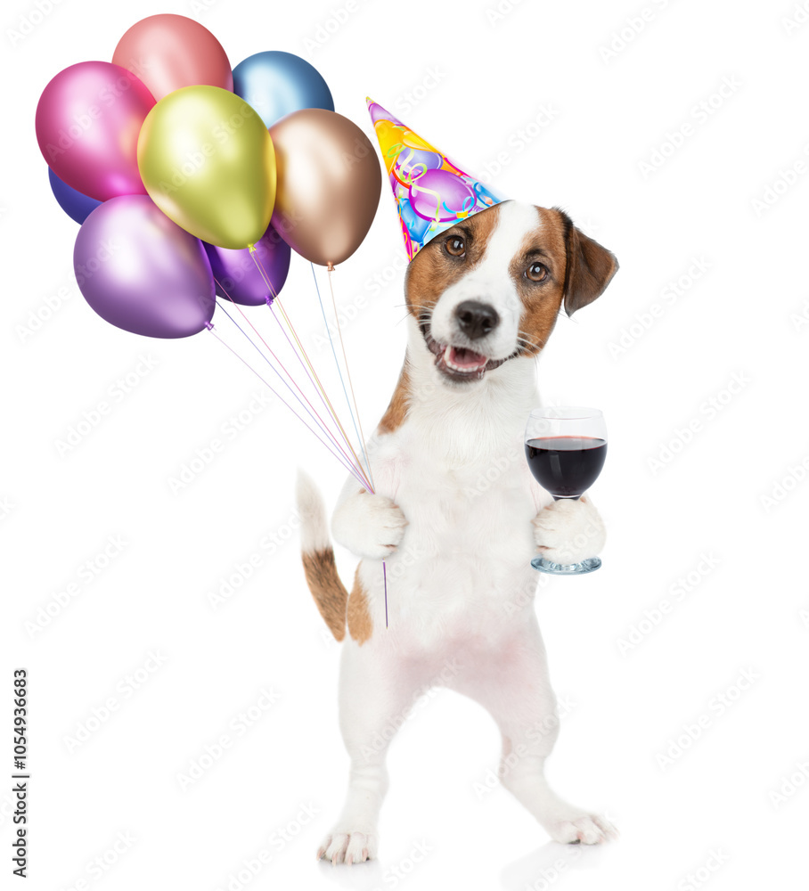 Happy jack russell terrier puppy wearing party cap holds balloons and glass of red wine. isolated on white background