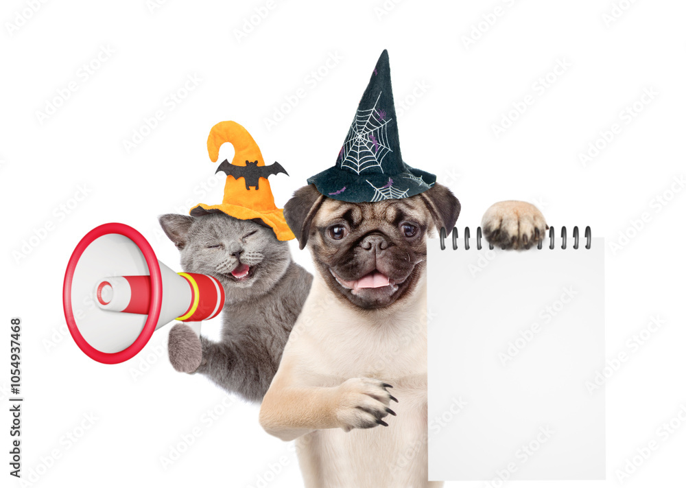 Happy cat and Pug puppy wearing hats for halloween looks at camera. Dog holds blank notepad. Kitten meowing into the megaphone. isolated on white background
