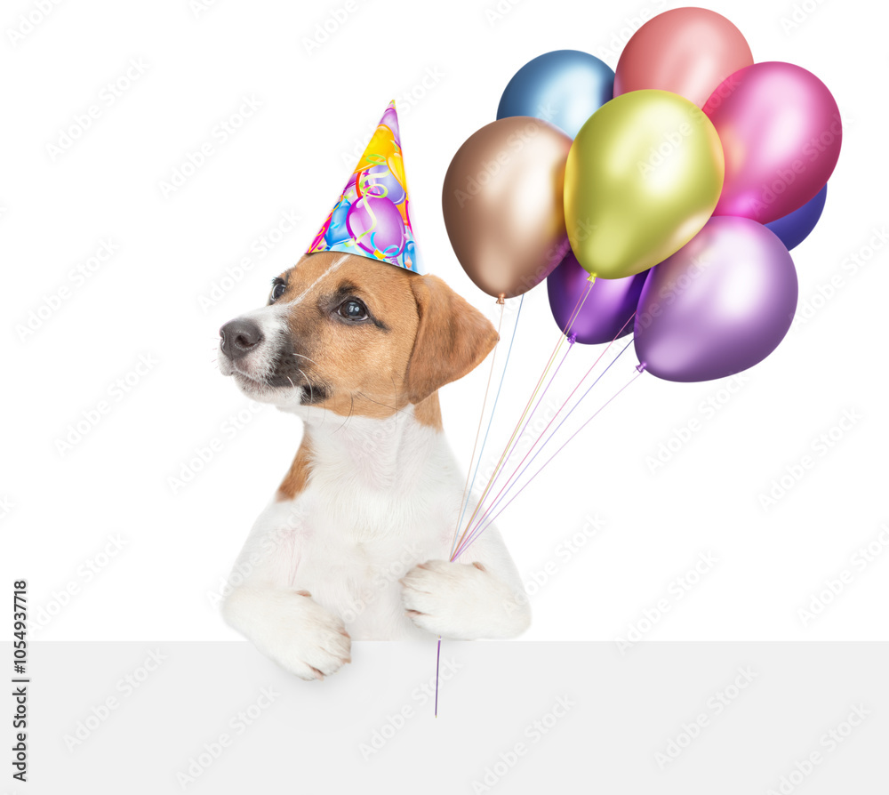 Cute jack russell terrier puppy wearing party cap holding balloons above blank white banner and looking away on empty space. isolated on white background