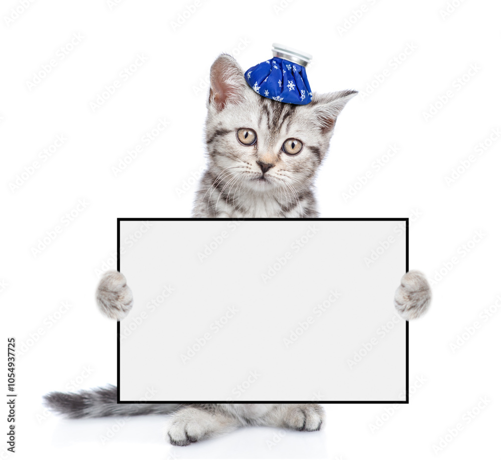 Sick kitten with ice bag or ice pack on his head holds blank white banner with empty space for text. Isolated on white background