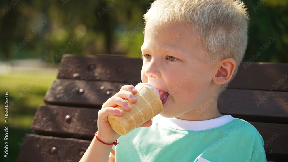 A young child happily enjoys an ice cream cone while sitting on a bench in a sunny park. The moment captures pure delight in warm weather.