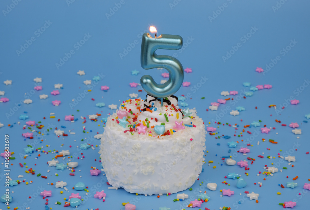Coconut birthday cake on blue background with burning candle number 5 and many colorful sprinkles.