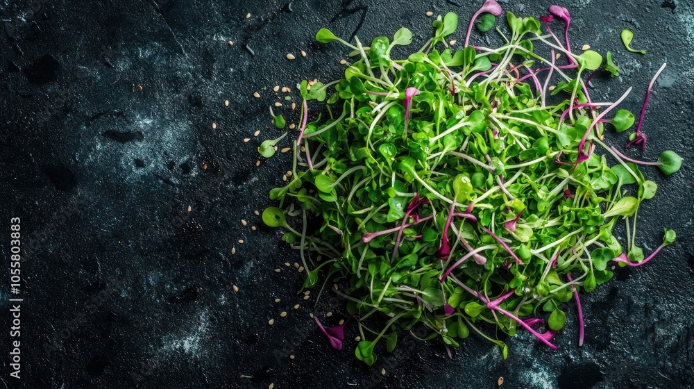 Mixed organic microgreens with water droplets on a dark background Fresh sunflower sprouts and a pile of alfalfa microgreens for nutritious vegan cooking Health and diet focus Top view