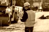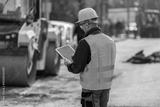 Construction worker in safety gear using a tablet to monitor progress at a busy urban site during daylight hours