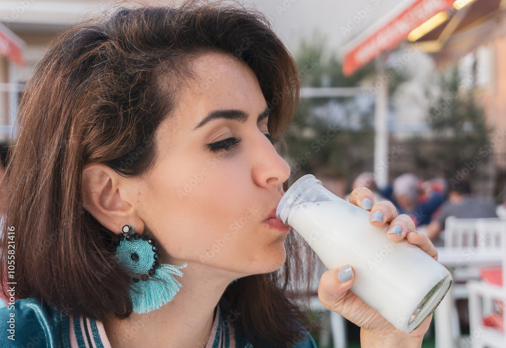 Woman drinking fresh ayran (buttermilk) from a glass bottle, enjoying a refreshing moment outdoors.