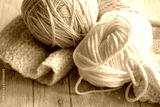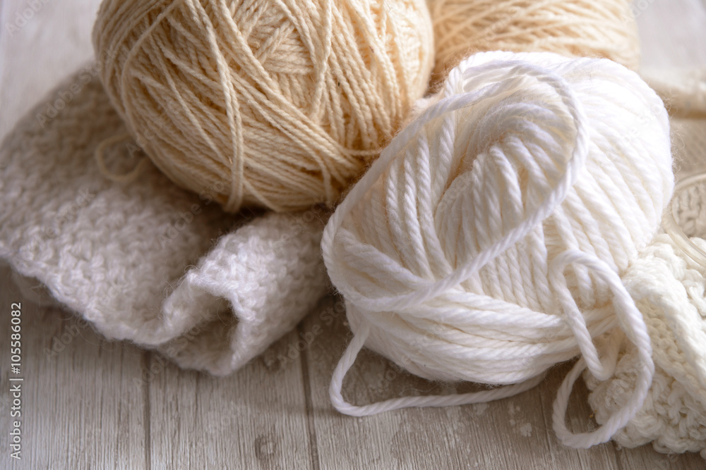 white and beige balls of yarn and knitting needles