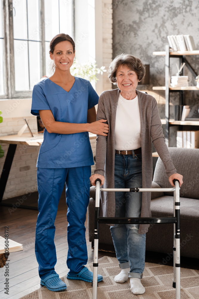 Smiling elderly patient and nurse medical worker with walking frame having rehabilitation after injury trauma looking at camera in hospital hospice