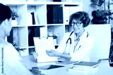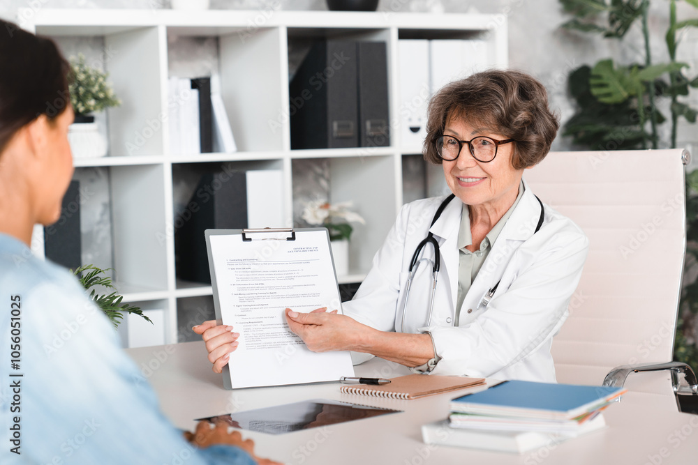 Medical worker doctor therapist family doctor showing explaining medical insurance, papers, diagnosis, test results to female patient at hospital. Signing papers