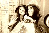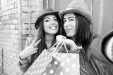 Cheerful women taking selfie with shopping bags - Young girlfriends having fun with self photo in old town - Concept of friendship and joyful youth - Soft vintage filter look with focus on right woman