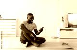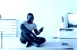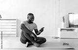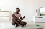 A young man sits on a yoga mat at home after exercising, smiling and using his smartphone, surrounded by plants and natural light in a relaxed atmosphere.