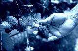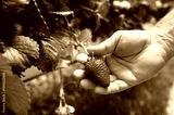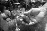 Farmer's working hand holding a strawberry in a hydroponic greenhouse