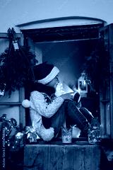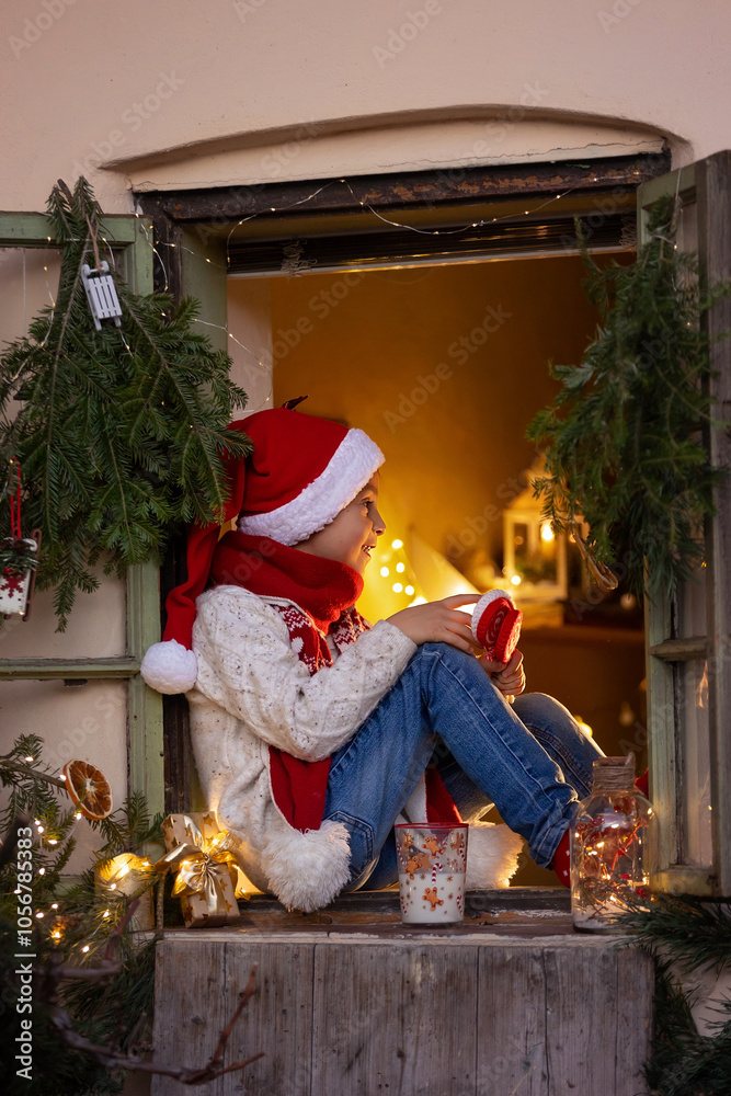 Beautiful blond child, boy, sitting on a christmas decorated window, drinking milk and eating apple, waiting for Santa Claus, Christmas concept