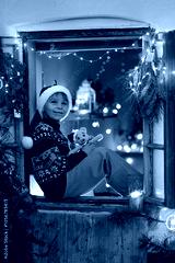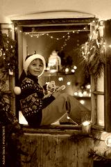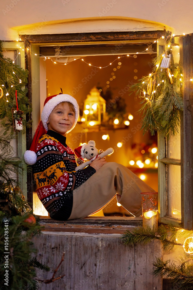 Beautiful blond child, boy, sitting on a christmas decorated window, drinking milk and eating apple, waiting for Santa Claus, Christmas concept