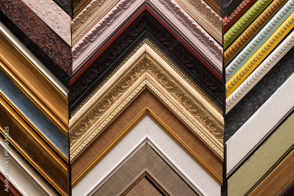 Craftsman working on frame in frame shop. Professional framer hand holding frame angle. Top view.