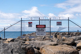 A chain-link fence with barbed wire on a breakwater in Werribee South displays multiple warning signs, including "Danger" "Do Not Enter" in multiple languages, to restrict access and warn the public