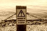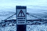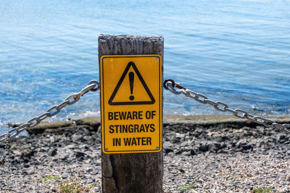 Australian Beach Safety: Warning Sign for Stingrays with Chain Barrier Overlooking Calm Blue Ocean. A Coastal Hazard Alert and Marine Safety Notice at Werribee South, Melbourne.