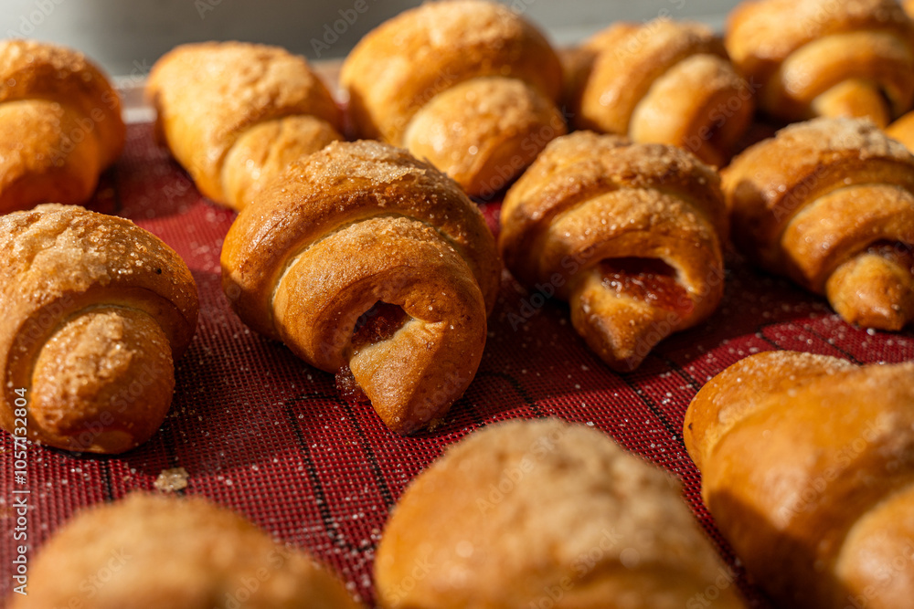 Croissants or bagels with jam on the production floor. Mini bakery, sweet pastries