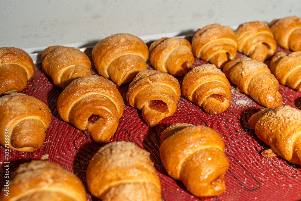 Croissants or bagels with jam on the production floor. Mini bakery, sweet pastries