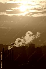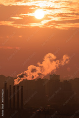 Evening view of the city. Sunset orange sky and beautiful cityscape, buildings and city streets, public place