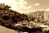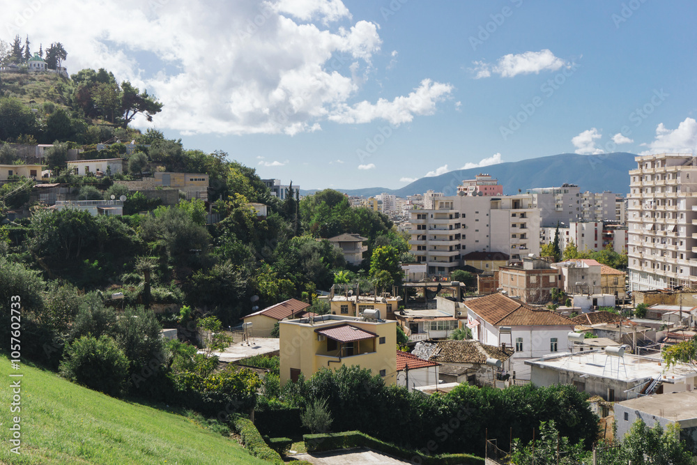 Panoramic view of Tirana cityscape from the Martyrs' Cemetery. Beautiful blend of urban architecture and lush greenery against the backdrop of Albanian mountains, showcasing Albanias vibrant capital