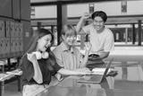 Three cheerful asian university students are celebrating their academic achievement while looking at a laptop, expressing joy and teamwork in an educational setting