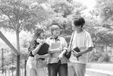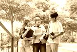 Three cheerful diverse college or university students chatting together outdoors on campus while holding notebooks and folders, enjoying their break time