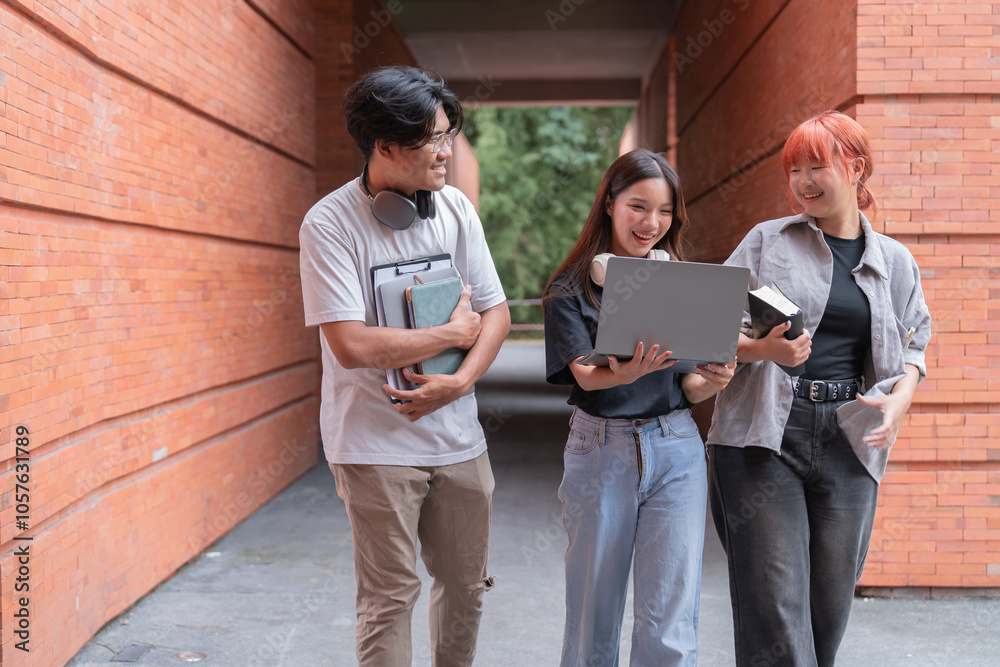 Three happy asian students are walking along university hallway, holding books and a laptop, enjoying their time together after class