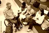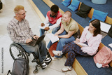 Group of diverse university students engaging in studying, sitting on campus steps, with notes and laptops, involving student in wheelchair, promoting collaborative learning atmosphere