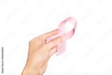 Isolated female hands holding a pink ribbon. Healthcare, medicine and breast cancer awareness concept.