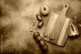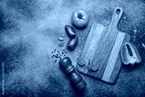 Fresh vegetables and spices on dark countertop with rustic cutting boards, top view. Healthy, organic cooking concept, copy space