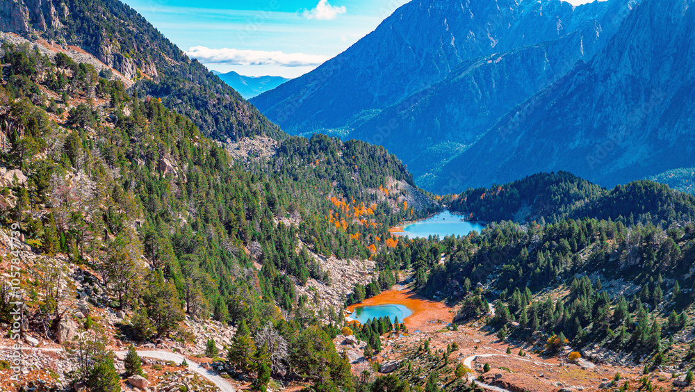 Aigüestortes i Estany de Sant Maurici National Park. General view of the two lakes of Ratera