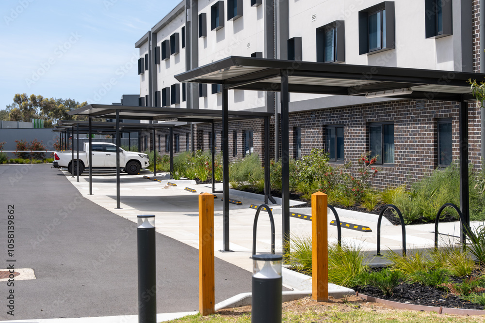 Contemporary residential development of a residential apartment complex with an integrated carport structure. Modern architectural design for urban living with covered parking bays.