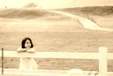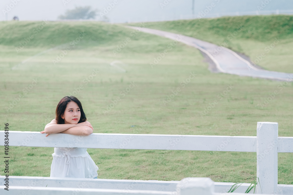 A serene moment in nature a young woman contemplates life by a white fence on a misty day surrounded by lush green fields and a winding pathway leading into the distance